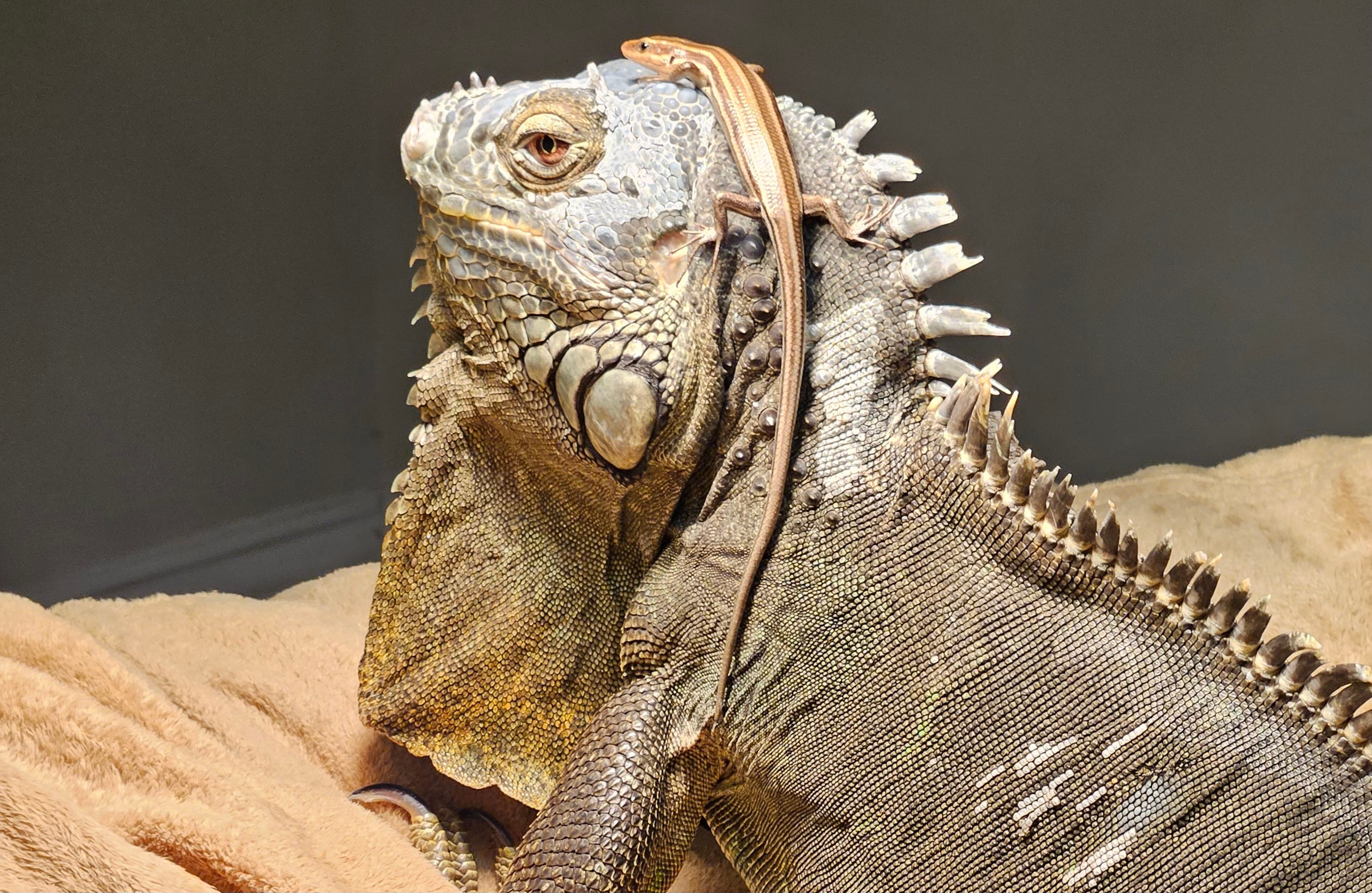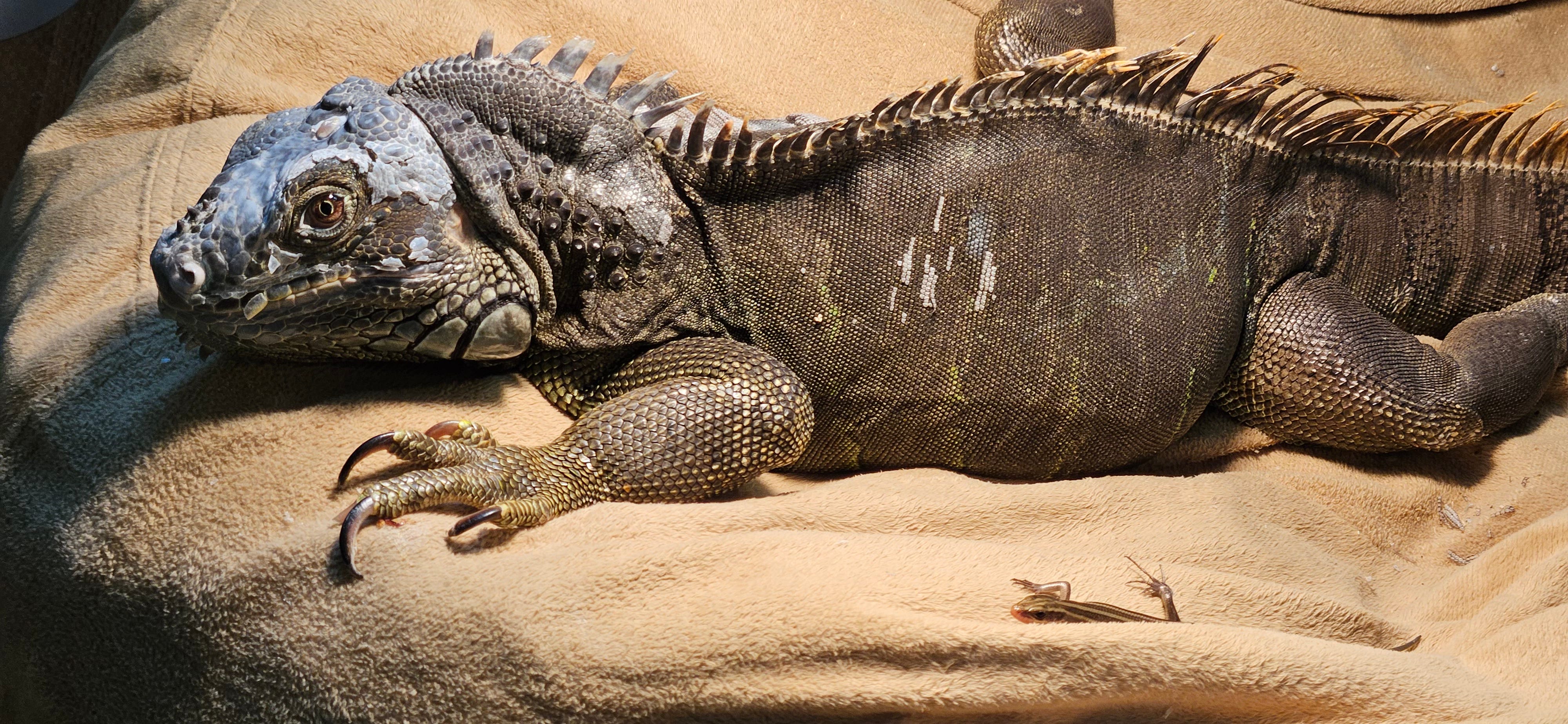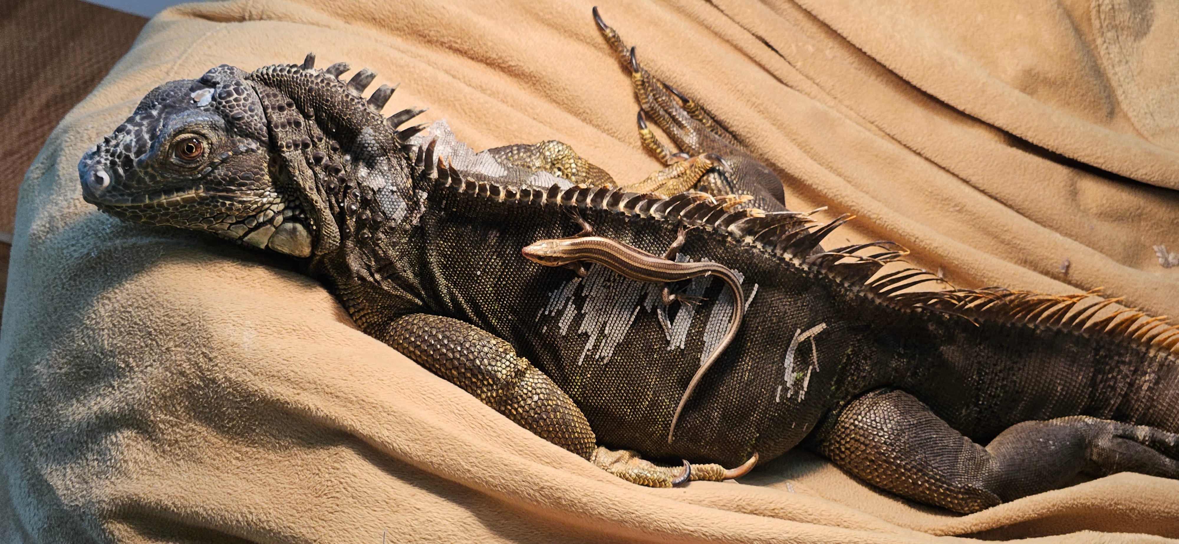 Hector is my 3-foot green tree iguana. The new guest is a 4-inch skink, of the southeastern five-lined variety.